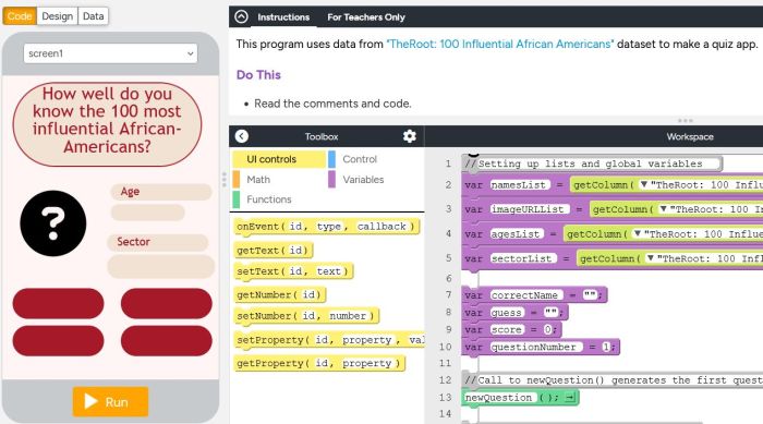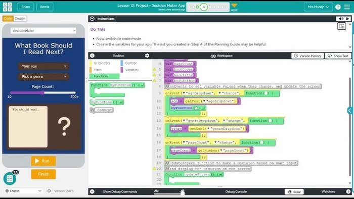 This unit explores how variables, conditionals, and functions allow for the design of increasingly complex apps. Learn how to program with these three new concepts through a sequence of collaborative activities. Then build your own decision maker app to share with friends and help them make a decision