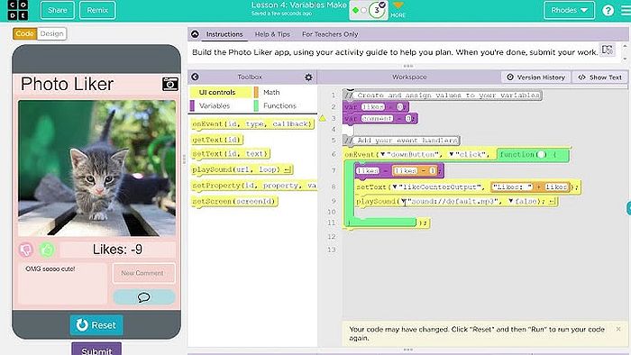 Using Programming Patterns and a step-by-step approach students make their own version of a Photo Liker app. At the beginning of the lesson students are able to explore a working version of the app. They are then given the design elements of the app but begin with a blank screen. A progression of levels guides students on the high level steps they should use to develop their app but leaves it to them to decide how to write the code. At the end students submit their apps and answer a free-response question in the style of a Create performance task written response prompt. Student apps and written responses can be assessed using a provided rubric.