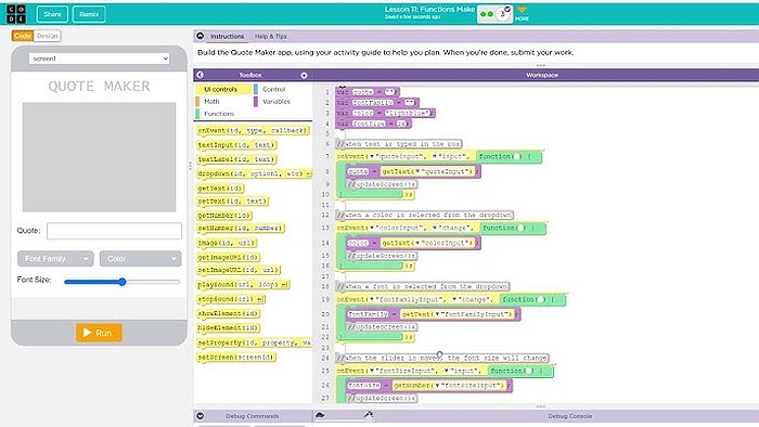 Using Programming Patterns and a step-by-step approach students make their own version of a Quote Maker app. At the beginning of the lesson students are able to explore a working version of the app. They are then given the design elements of the app but begin with a blank screen. Students use an Activity Guide to go through the high level steps they should use to develop their app but leaves it to them to decide how to write the code. At the end students submit their apps and answer a free-response question in the style of a Create performance task written response prompt. Student apps and written responses can be assessed using a provided rubric.