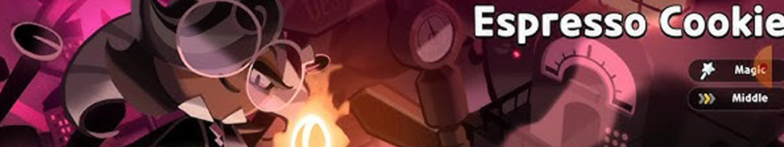 Espresso Cookie is an Epic Cookie available since launch. He is of the Magic type and his position is prioritized to the Middle. Espresso Cookie is the esteemed pioneer and proponent of Coffee Magic, researching and experimenting through many sleepless nights to refine his craft. He resides wherever the best research opportunities lie, teaching at Parfaedia Institute before experimenting on Soul Jams at home in the Crème Republic and then moving to the Vanilla Kingdom to work alongside Strawberry Crepe Cookie. Espresso Cookie exudes carefully-composed confidence while remaining understated. A no-nonsense intellectual, he loathes wasting time and harbors deep contempt for illogical ventures like White Magic and the Crème Republic's worship of the Divine.