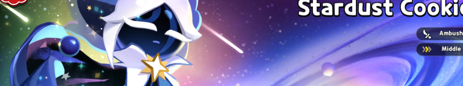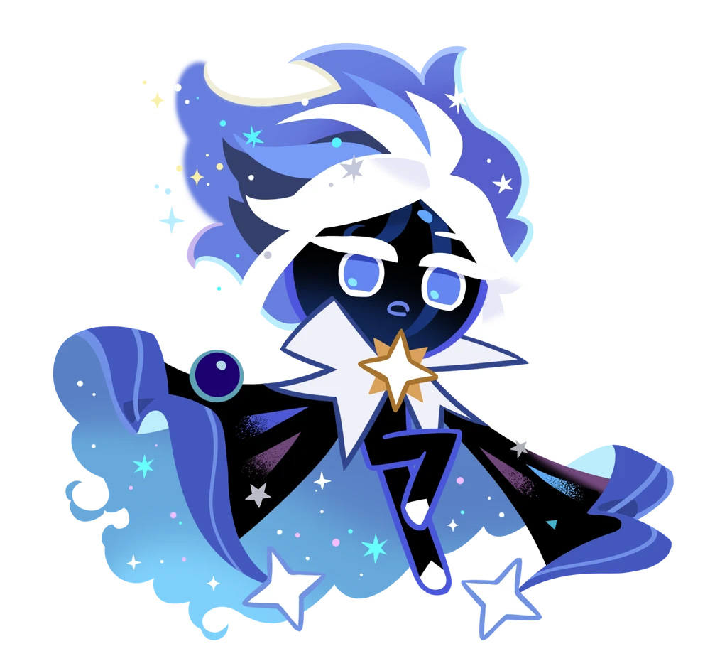 Stardust Cookie is a Super Epic Cookie who first appeared in Fateful Moonrise update (v4.1) and became playable alongside Space Doughnut in the Across the Galaxy of Dreams update (v4.2). He is of the Ambush type and his position is prioritized to the Middle. Stardust Cookie is a Cookie born from "imperfect" dough imbued with nameless starlight, an unforeseen byproduct of Moonlight Cookie's flawless, moonlight-infused dough that the Wizards discarded into space. Baked by the light of the stars, he travels across the cosmos in search of his origins and a place to call home. He first appeared as an NPC in the Story of Eternal City of Wizards, where he arrived in the titular city. However, he was teased as early as Dream Express, which warned of a coming disaster in the form of a spacefaring Cookie.