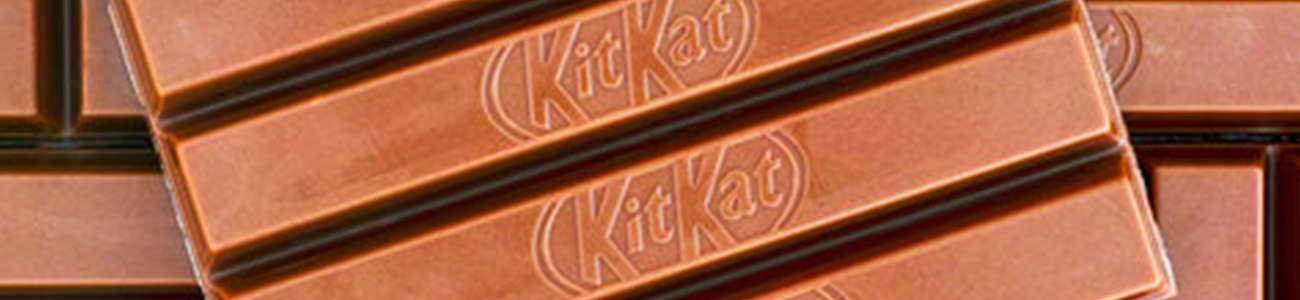 Kit Kat is a chocolate bar created by Rowntree's of York, England. It is produced globally by Nestlé (which acquired Rowntree's in 1988),[1] except in the United States, where it is made under licence by the H. B. Reese Candy Company, a division of the Hershey Company (an agreement Rowntree's first made with Hershey in 1970).[2] Standard Kit Kat bars have two or four pieces, known as “fingers.” Each finger has three layers of wafer covered in a thin coating of chocolate. Each finger can be snapped from the bar separately. There are many flavours of Kit Kat, including milk, white, and dark chocolate. The original four-finger version of the bar was developed after a worker at Rowntree's York factory put a suggestion in the recommendation box for "a chocolate bar that a man could take to work in his pack up".[3] It was launched in September 1935 in the UK as Rowntree's Chocolate Crisp, and the later two-finger version was launched in 1936. It was renamed Kit Kat Chocolate Crisp in 1937, and just Kit Kat after World War II.[4] Since making its first television appearance in a British commercial in 1958, the slogan for the Kit Kat in the UK and elsewhere has been "Have a break... have a Kit Kat".[4][5][6] Since 1986 in the US, the jingle used in television advertisements includes the phrase “Gimme a break, Gimme a break, Break me off a piece of that Kit Kat bar!"[7]