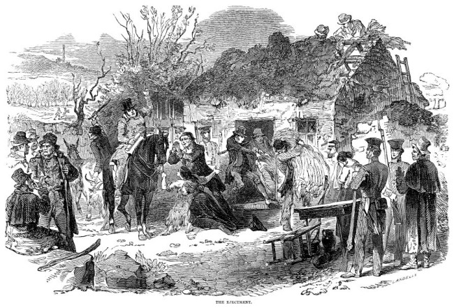 The Great Famine, also known as the Great Hunger (Irish: an Gorta Mór [ənˠ ˈɡɔɾˠt̪ˠə ˈmˠoːɾˠ]), the Famine and the Irish Potato Famine,[1][2] was a period of mass starvation and disease in Ireland lasting from 1845 to 1852 that constituted a historical social crisis and had a major impact on Irish society and history as a whole.[3] The most severely affected areas were in the western and southern parts of Ireland—where the Irish language was dominant—hence the period was contemporaneously known in Irish as an Drochshaol,[4] which literally translates to "the bad life" and loosely translates to "the hard times". The worst year of the famine was 1847, which became known as "Black '47".[5][6] The population of Ireland on the eve of the famine was about 8.5 million; by 1901, it was just 4.4 million.[7] During the Great Hunger, roughly one million people died and over one million more fled the country,[8] causing the country's population to fall by 20–25% between 1841 and 1871, with some towns' populations falling by as much as 67%.[9][10][11] Between 1845 and 1855, at least 2.1 million people left Ireland, primarily on packet ships but also on steamboats and barques—one of the greatest exoduses from a single island in history.[12][13] The proximate cause of the famine was the infection of potato crops by blight (Phytophthora infestans)[14] throughout Europe during the 1840s. Impact on food supply by blight infection caused 100,000 deaths outside Ireland, and influenced much of the unrest that culminated in European Revolutions of 1848.[15] Longer-term reasons for the massive impact of this particular famine included the system of absentee landlordism[16][17] and single-crop dependence.[18][19] Initial limited but constructive government actions to alleviate famine distress were ended by a new Whig administration in London, which pursued a laissez-faire economic doctrine, but also because some in power believed in divine providence or that the Irish lacked moral character,[20][21] with aid only resuming to some degree later. Large amounts of food were exported from Ireland during the famine and the refusal of London to bar such exports, as had been done on previous occasions, was an immediate and continuing source of controversy, contributing to anti-British sentiment and the campaign for independence. Additionally, the famine indirectly resulted in tens of thousands of households being evicted, exacerbated by a provision forbidding access to workhouse aid while in possession of more than one-quarter acre of land. The famine was a defining moment in the history of Ireland,[3] which was part of the United Kingdom of Great Britain and Ireland from 1801 to 1922. The famine and its effects permanently changed the island's demographic, political, and cultural landscape, producing an estimated 2 million refugees and spurring a century-long population decline.[22][23][24][25] For both the native Irish and those in the resulting diaspora, the famine entered folk memory.[26] The strained relations between many Irish people and the then ruling British government worsened further because of the famine, heightening ethnic and sectarian tensions and boosting nationalism and republicanism both in Ireland and among Irish emigrants around the world. English documentary maker John Percival said that the famine "became part of the long story of betrayal and exploitation which led to the growing movement in Ireland for independence." Scholar Kirby Miller makes the same point.[27][28] Debate exists regarding nomenclature for the event, whether to use the term "Famine", "Potato Famine" or "Great Hunger", the last of which some believe most accurately captures the complicated history of the period.[29] The potato blight returned to Europe in 1879 but, by this time, the Land War (one of the largest agrarian movements to take place in 19th-century Europe) had begun in Ireland.[30] The movement, organized by the Irish National Land League, continued the political campaign for the Three Fs which was issued in 1850 by the Tenant Right League during the Great Famine. When the potato blight returned to Ireland in the 1879 famine, the League boycotted "notorious landlords" and its members physically blocked the evictions of farmers; the consequent reduction in homelessness and house demolition resulted in a drastic reduction in the number of deaths.[31]
