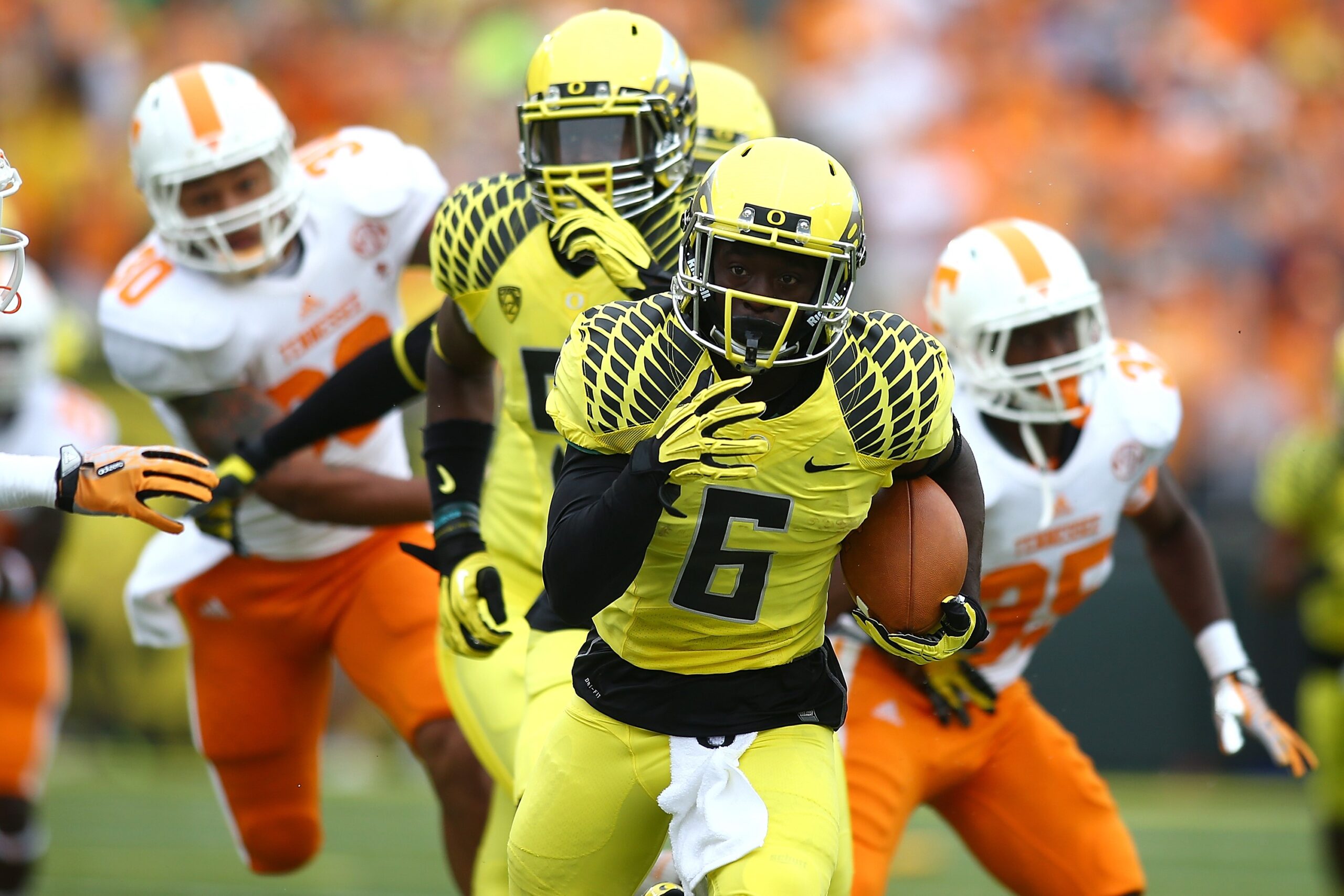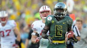 At Oregon, Thomas quickly became a household name. As a freshman in 2011, he showcased his versatility by scoring touchdowns as a runner, receiver, and returner, finishing the season with over 2,200 all-purpose yards. His combination of track-star speed, vision, and elusiveness made him a constant big-play threat every time he touched the ball. One of his most memorable performances came in the 2013 Fiesta Bowl, where he returned the opening kickoff 94 yards for a touchdown and added another long scoring run, earning Offensive MVP honors.
