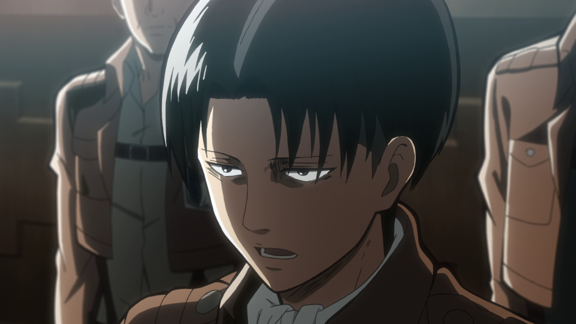 Levi Ackermann (リヴァイ・アッカーマン Rivai Akkāman?), often formally referred to as Captain Levi (リヴァイ兵長 Rivai Heichō?), is the squad captain (兵士長 Heishichō?, lit. "leader of the soldiers") of the Special Operations Squad within the Scout Regiment, and is said to be humanity's strongest soldier.[1]Levi has short, straight black hair styled in an undercut, as well as narrow, intimidating steel blue eyes with dark circles under them and a deceptively youthful face. He is quite short, but his physique is well-developed in musculature from extensive omni-directional mobility gear usage. He is usually either frowning or expressionless; that, plus his extremely calm demeanor, often makes it difficult for others to guess what he is thinking. He is most often seen in his Scout Regiment uniform, with a light gray button-up shirt underneath along with his trademark white ascot, though since the coup d'etat, he has left it off. When embarking on expeditions outside the Walls, he also wears the Scout Regiment's green-hooded cloak; like the rest of the Scouts who traveled and fought against the Marleyan troops, Levi wore the new all-black variant of the Scout Regiment's uniform. When forced to take leave from his duties due to injury, Levi was seen in a black suit, plain white shirt, ascot, and dress shoes. After a close-encounter explosion from a Thunder Spear set off by Zeke Jaeger, Levi now has several scars across his face including one across his right eye and is missing both the index and middle fingers on his right hand. [15] Following an incident during the Battle of Heaven and Earth, Levi has been confined to a wheelchair Levi is described as a "clean freak" by those who know him personally, as he prefers his environment and himself to be spotlessly clean. He is averse to having either himself or his equipment soiled, and he has been known to wipe down his blood-smeared blades while still on the battlefield. However, he will not hesitate to touch filth if he deems it necessary.[6] Despite his preoccupation with cleanliness, Levi is abrasive and not very approachable. He rarely shows emotion, giving a cold impression to others. His manner of speaking tends to be blunt and insulting, his comments are frequently coarse or otherwise inappropriate, and he is not above provoking or belittling those who oppose or irritate him. His sense of humor tends toward the vulgar, insulting, and morbid. All of this makes him unsettling to a great number of people. In his pre-Scout Regiment criminal life, when he lived in the Underground City, Levi refused to take orders from anyone (as Petra Rall tells Eren Jaeger).[17] However, after he joined the Scout Regiment, he came to greatly respect Commander Erwin Smith, whose orders he follows willingly because he strongly believes in Erwin's vision for the Scouts. He also places great trust in his subordinates. However, Levi's obedience is strictly limited to individuals he respects, and he has no problem showing open disdain for authority from anyone outside of this circle. At Eren's tribunal, he insulted the merchants by calling them "pigs" and told the Military Police that they were not competent enough to handle Eren.[18] He even sardonically suggests that they join the Scout Regiment, which caused them to back off. He openly resents most of the MPs for their continual attempts to undermine the Scouts, and also presumably because of the criminal life he led before he joined the Scouts. Although he rarely shows it, Levi does have a sense of morality and empathy. One of his most defining characteristics is the great value he places on preserving human life: this is especially shown when it was revealed that all Titans might have once been human themselves. The thought that he had unknowingly been killing humans all this time disturbs him greatly. He himself has stated that he hates unnecessary casualties, and he tells his subordinates to use their judgment so that they can avoid blunders that may cost them their lives.