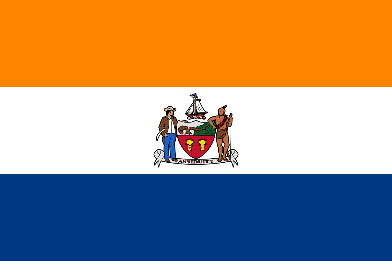The flag of Albany, New York consists of a tricolour of orange, white and blue with the former containing the coat of arms of Albany, as designed in 1789. The flag is based on Prince's Flag as flown by the Dutch East India Company (VOC), for which Hudson sailed in 1609. |