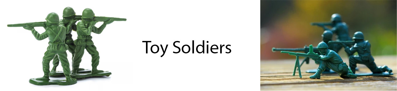 - Army men: Inexpensive, unpainted plastic soldiers molded in various action poses, most famously in green and tan.