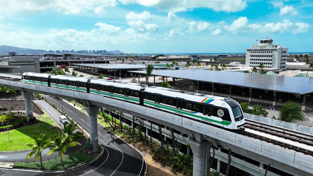 A Skyline train flying past Honolulu International Airport |