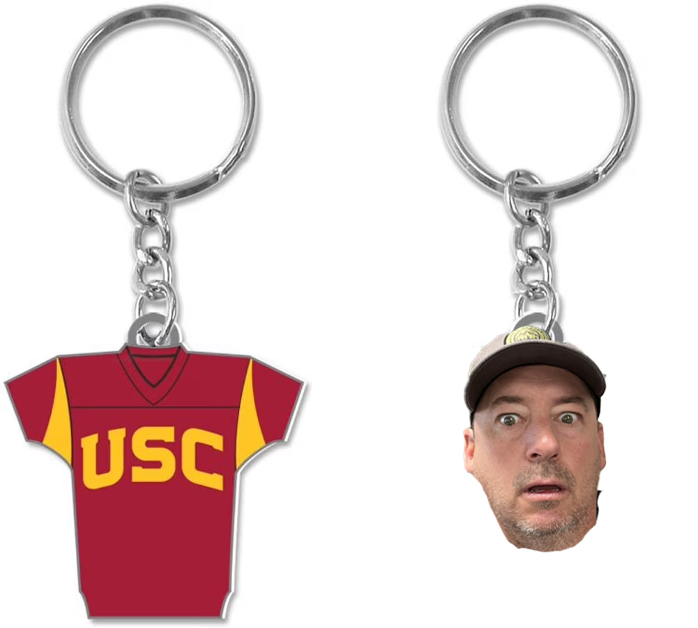 Coach Burrill Keychain: Sold in a matching set of two, our Coach Burrill keychain features a USC jersey and a Coach Burrill head. Maybe one day, we'll sell a version with a full body. Your purchase of the pair for $4.99 will enable us to invest in creating the full-body Burrill keychain. |